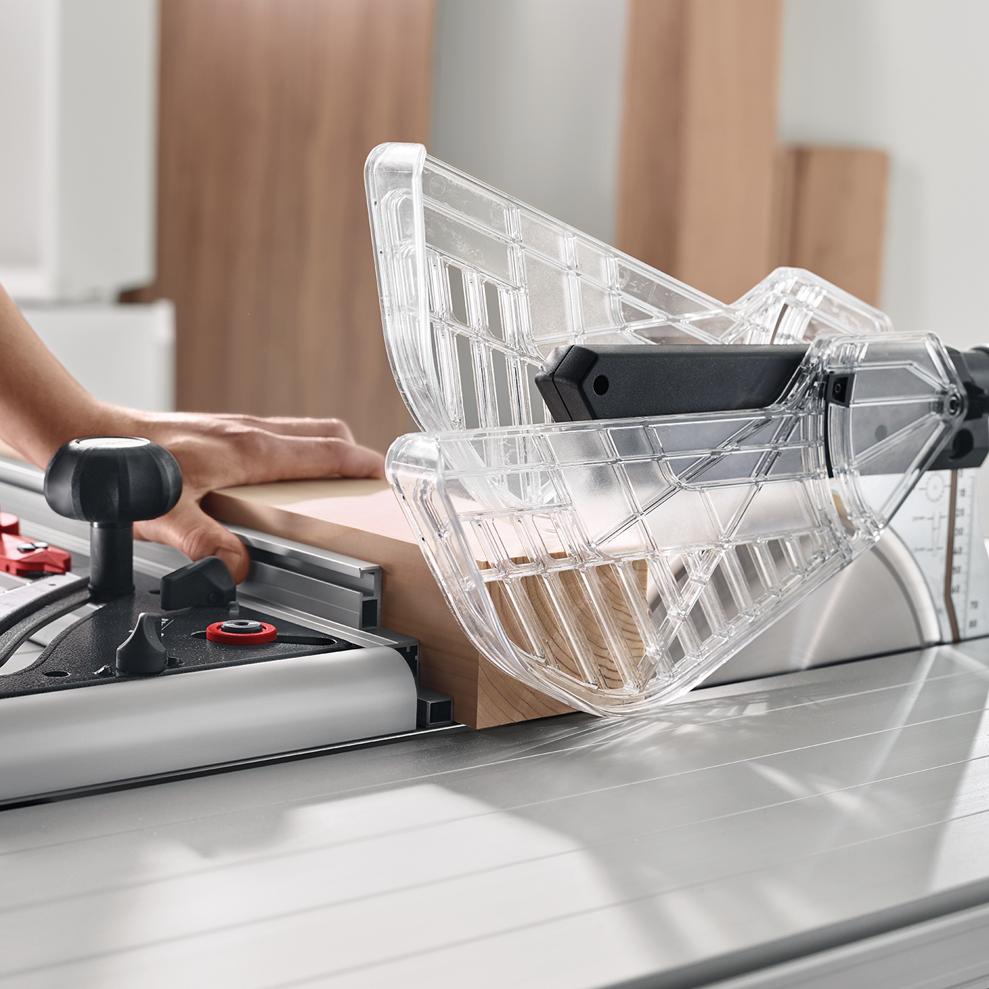 Weitere Pluspunkte für die ERIKA 85: Extrem stabiles Tischprofil, Schwenkbereich von -3° bis 48°, ein absenkbarer Spaltkeil und die max. Schnittlänge von 430 mm.