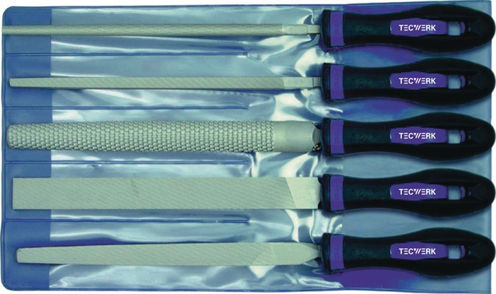 mit 2K-Kunststoffheft · aus hochwertigem Stahl · in Kunststofftasche · Inhalt: flachstumpf, halbrund, rund, dreikant, Raspel halbrund