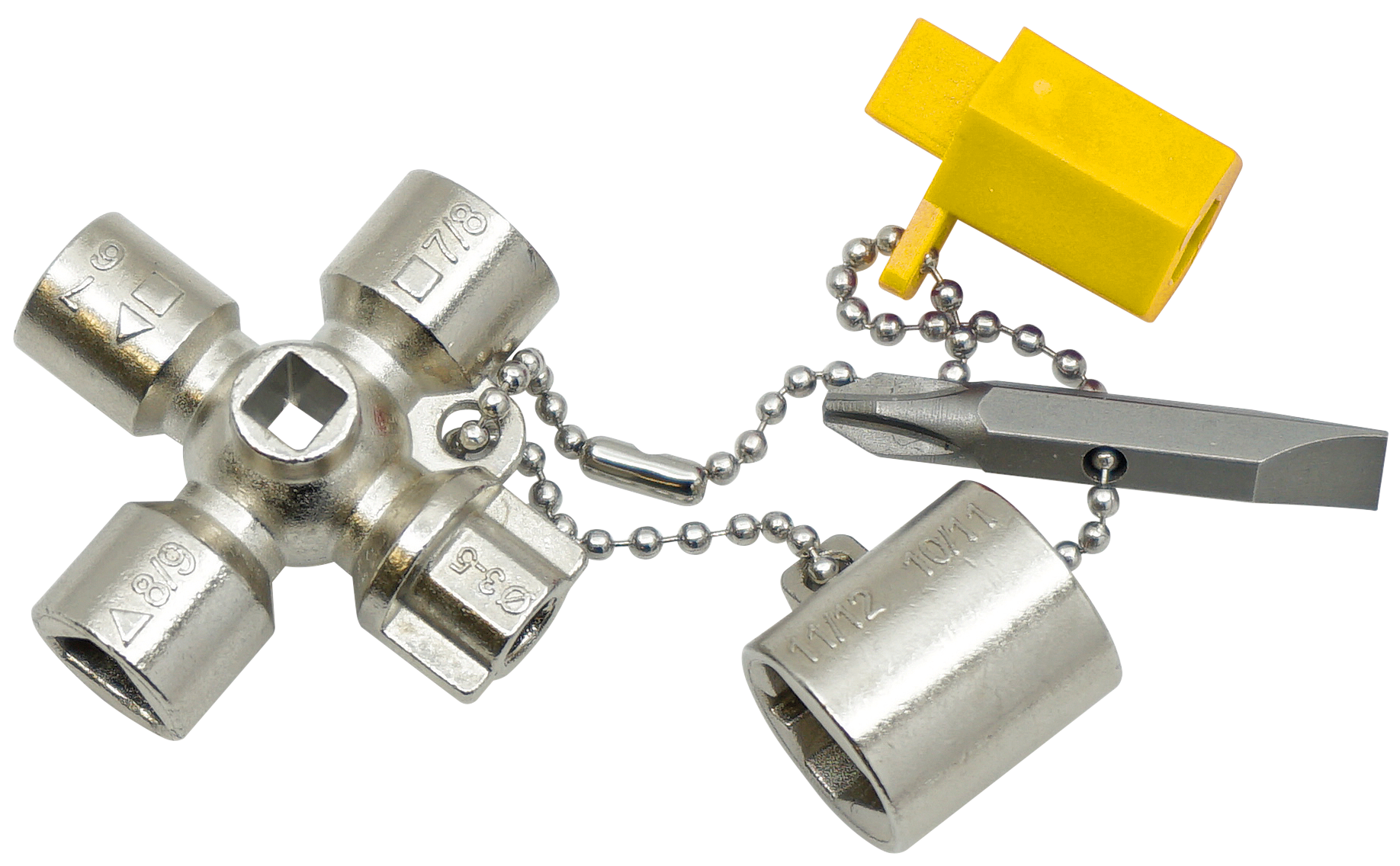 Kreuzsteck-Schaltschrankschlüssel mit Kunststoffadapter und Wendebit für technische Anlagen in Gebäuden, wie beispielsweise Schaltschränke, Klima- und Belüftungsanlagen oder Absperrventile. Die 15 unterschiedlichen Schließungen und die kompakte sowie robuste Bauweise aus Zinkdruckguss machen diesen Schaltschrankschlüssel äußerst vielseitig.