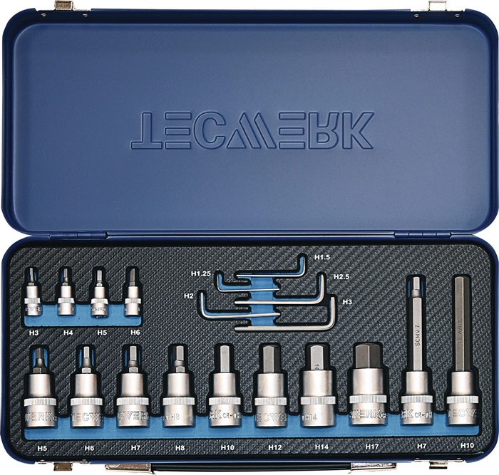 6,3 mm (1/4 ″)-und 12,5 mm (1/2 ″)-Vierkantantrieb · praktische zweifarbige Einlage zur einfachen Werkzeug-Vollzähligkeitskontrolle · für Schrauben mitInnensechskant-Profil · CV-Stahl · Inhalt:mit 6,3 mm (1/4 ″)-Vierkantantrieb · je 1 Steckschlüssel-Einsatz für Schrauben mit Innensechskant-Profil Gr. 3 / 4 / 5 / 6 mm mit 12,5 mm (1/2 ″)-Vierkantantrieb · je 1 Steckschlüssel-Einsatz Gr. 5 / 6 / 7 / 8 / 10 / 12 / 14 / 17 mm · je 1 Steckschlüssel-Einsatz 100 mm lang, Gr. 8 / 10 mm · je 1 Sechskant-Stiftschlüssel Gr. 1,25 / 1,5 / 2 / 2,5 / 3 mm